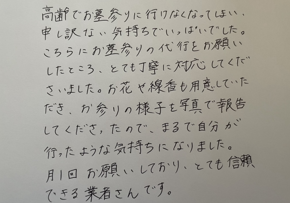 【満足度:90点】 伊藤様(70代男性) 「高齢でお墓参りに行けなくなってしまい、申し訳ない気持ちでいっぱいでした。こちらにお墓参りの代行をお願いしたところ、とても丁寧に対応してくださいました。お花や線香も用意していただき、お参りの様子を写真で報告してくださったので、まるで自分が行ったような気持ちになりました。月1回お願いしており、とても信頼できる業者さんです。」